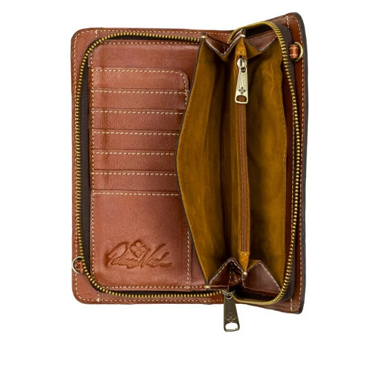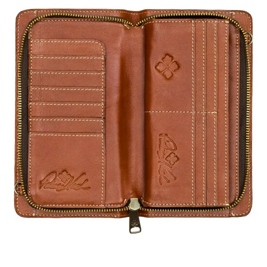| Pockets: | Accordion-style compartment with zippered coin pocket divider, 12 credit card slots, 2 bill slots and a ticket/document slip pocket |