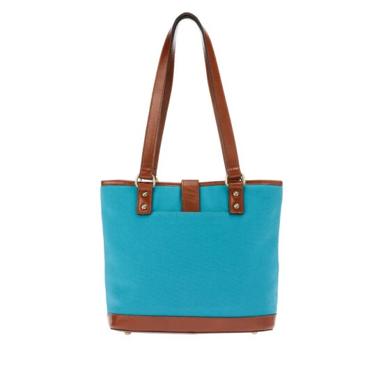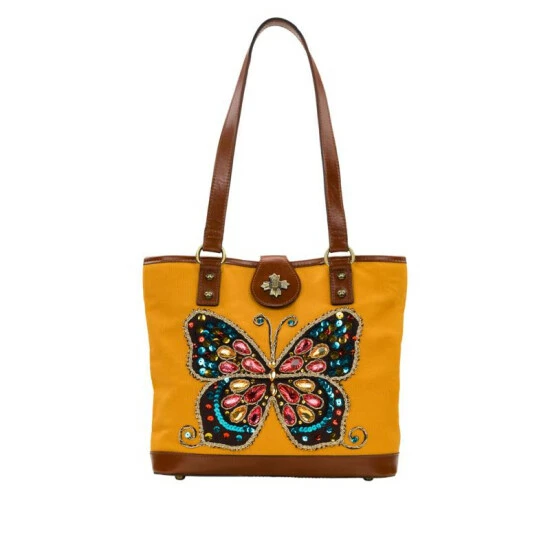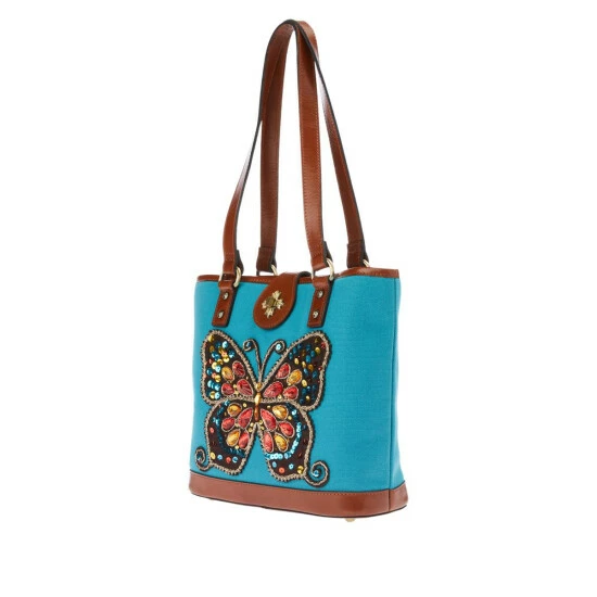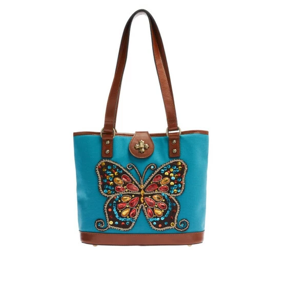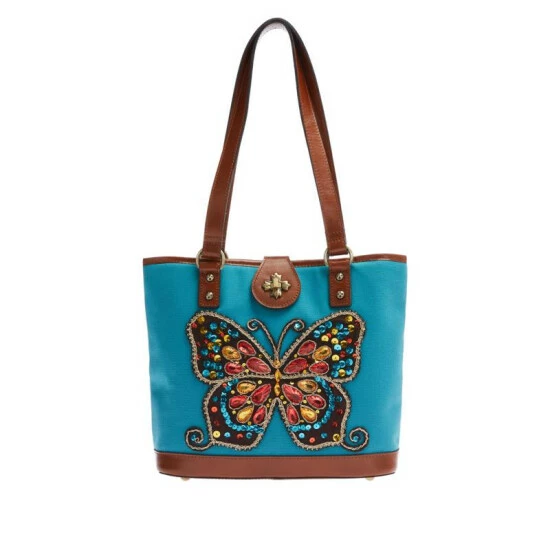A mix of colors and materials give this tote a glitzy flair. Embellished with a bold butterfly artistically designed with crystals, this go-anywhere tote is both practical and glamorous.