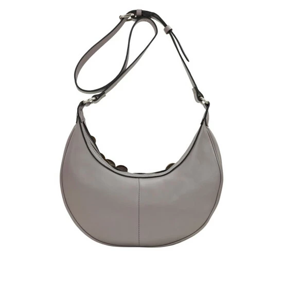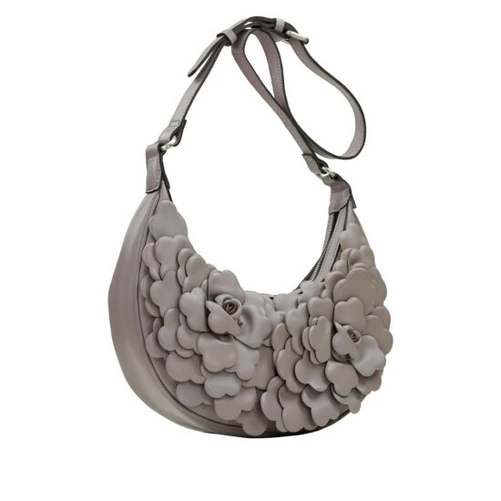 Reach for the moon with this pretty crescent-shaped bag. The sweet silhouette isn’t just stellar in appearance; it’s also wonderfully practical with the top zipper covering the entire length of the bag, allowing for convenient access to its contents. And with leather flower petal detail on the front, it’s like carrying a little piece of Springtime where ever you go.