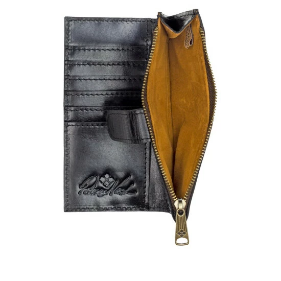 Craftedwith high-quality, artisan detail, this beautiful bifold leatherwallet from Patricia Nash features multiple pockets and compartmentsto add extra functionality to the luxurious look.